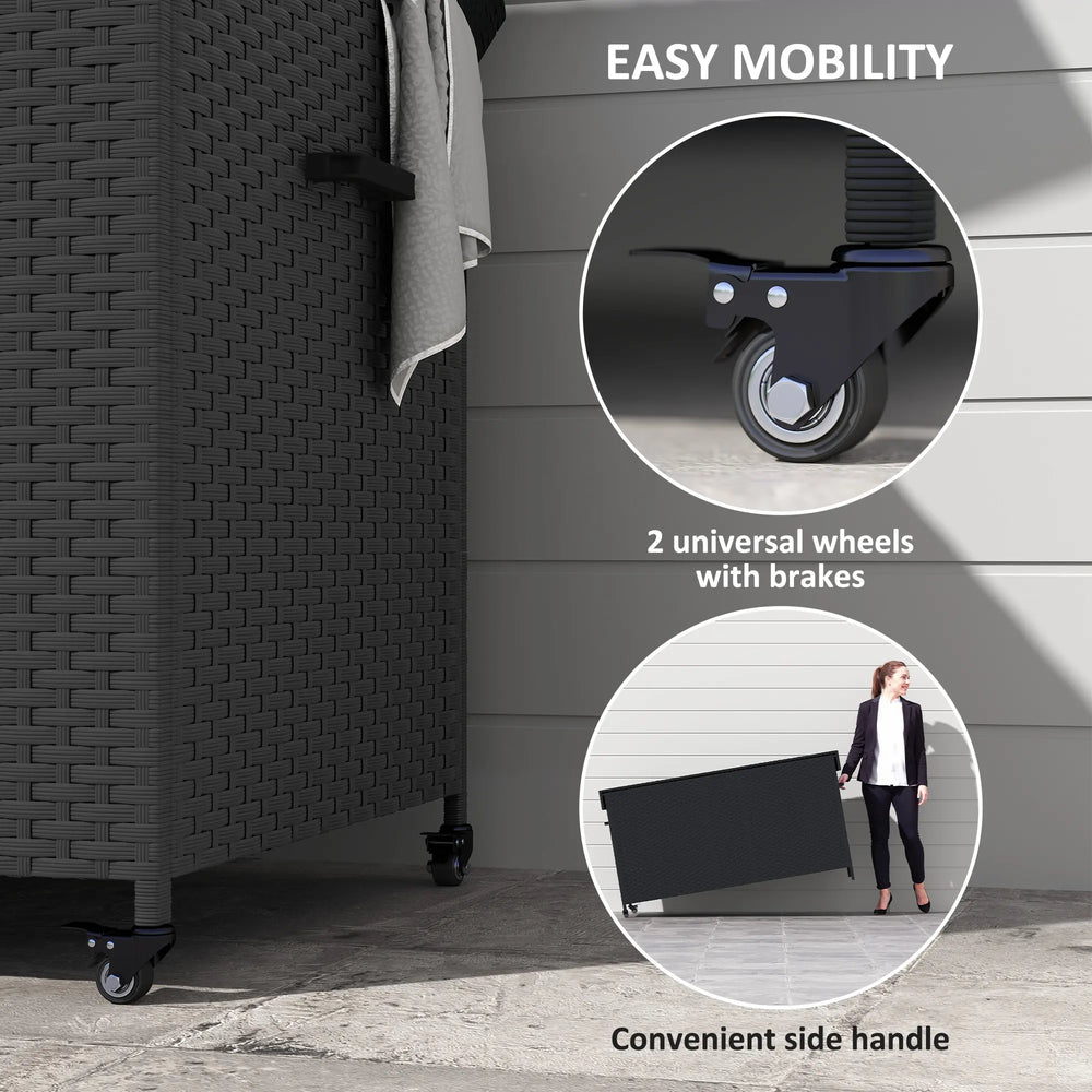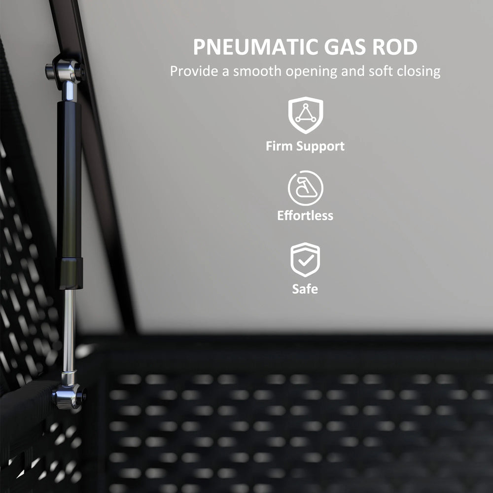 This Outsunny 627 L garden storage box is a safe, protective place for garden tools, supplies and other accessories. Fitted with a gas strut lift mechanism to ensure the lid opens and closes safely and steadily. A powder coated steel frame means a strong core, wrapped in stylish and tough plastic rattan. Complete with a handle and two wheels to move around, even when heavy.