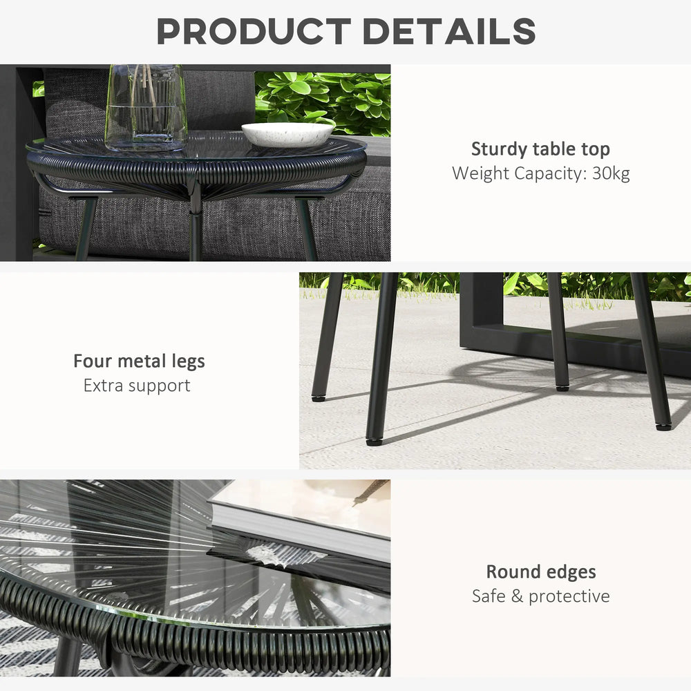 Outsunny Rattan Side Table, Round Outdoor Coffee Table, with Round PE Rattan and Tempered Glass Tabletop for Patio, Garden, Balcony, Black
