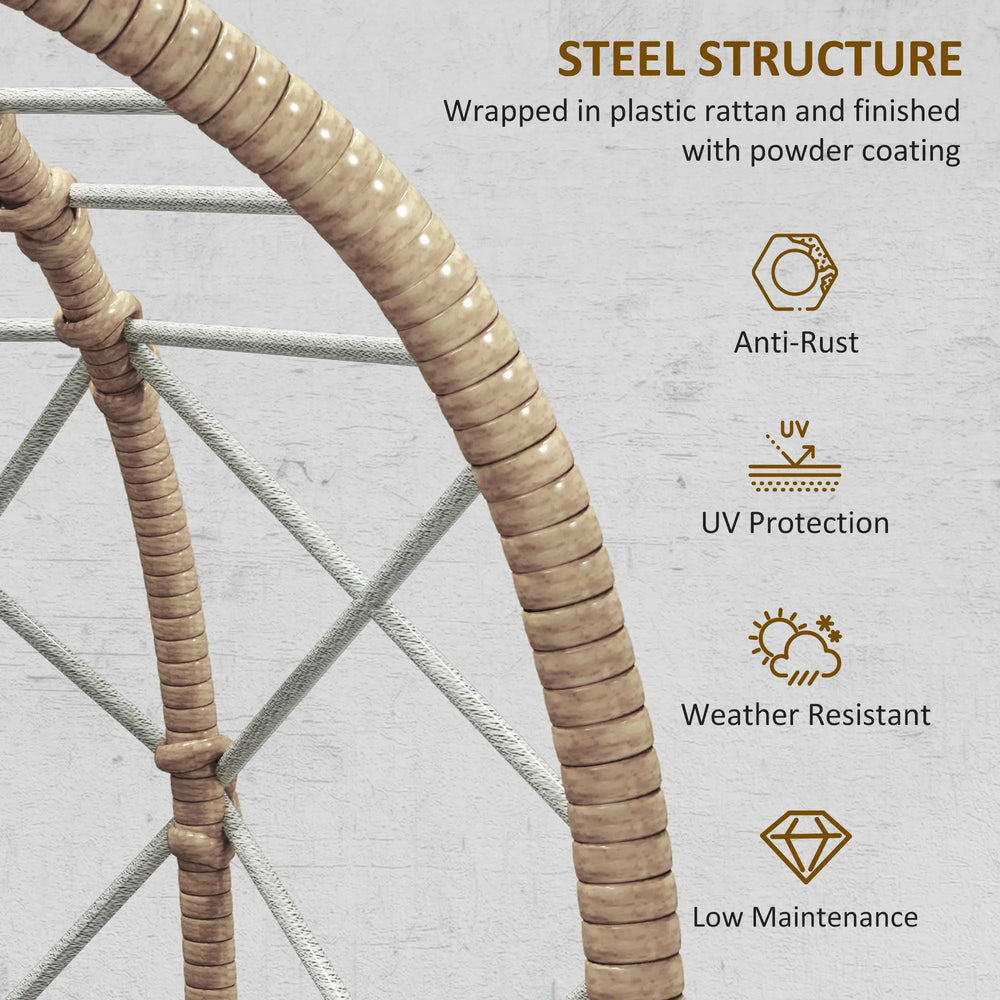 Relax in optimal comfort with this outdoor standing egg chair from Outsunny! This rattan garden chair with a rope woven hollow-out design is like a cosy bird-nest retreat. 20cm thickened cushion and a separate head pillow offer luxurious comfort. A steel frame means a strong, supportive core, whilst the outer plastic rattan wicker offers a stylish and protective top. Complete with a side cup holder for keeping drink within reach.