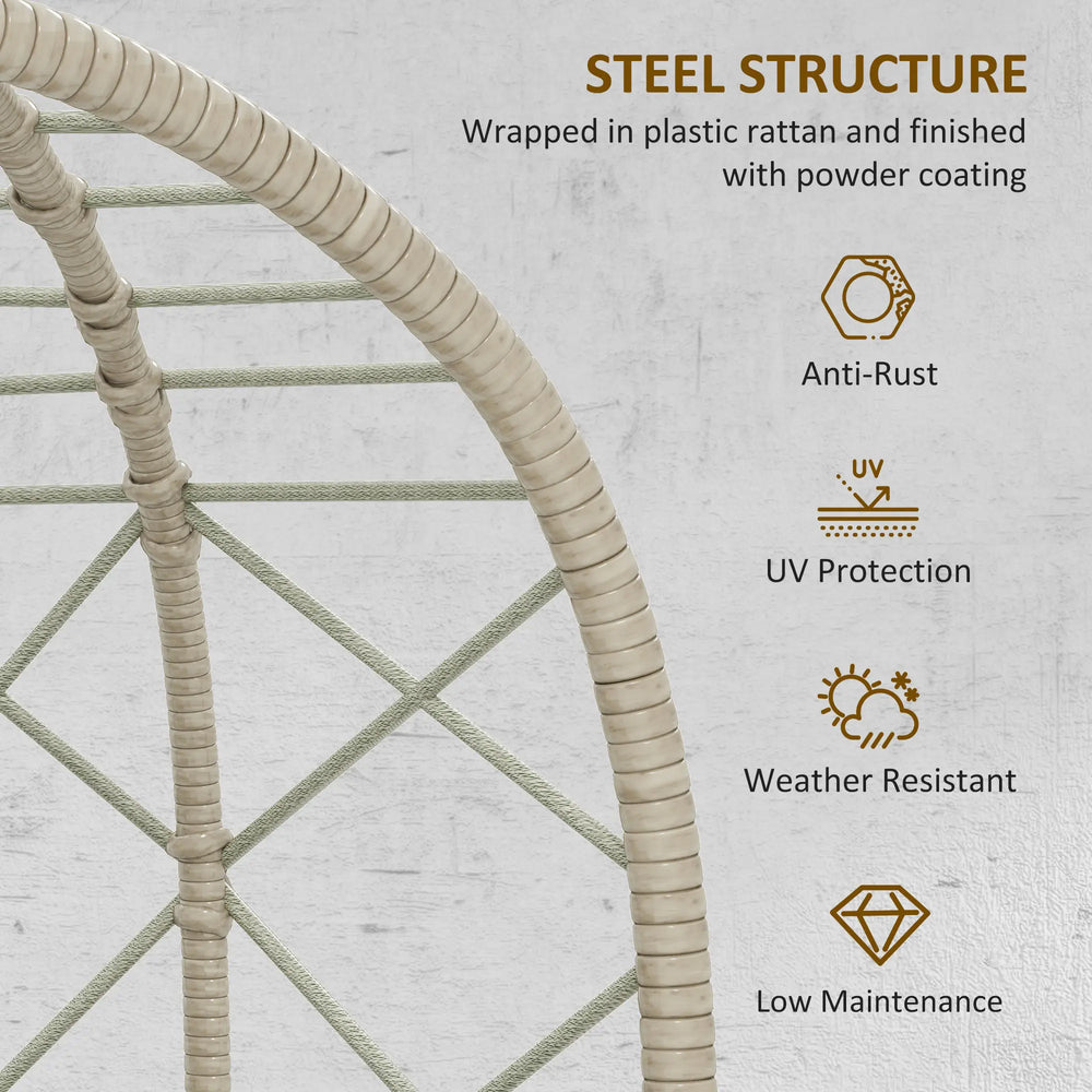Relax in optimal comfort with this outdoor standing egg chair from Outsunny! This rattan garden chair with a rope woven hollow-out design is like a cosy bird-nest retreat. 20cm thickened cushion and a separate head pillow offer luxurious comfort. A steel frame means a strong, supportive core, whilst the outer plastic rattan wicker offers a stylish and protective top. Complete with a side cup holder for keeping drink within reach.