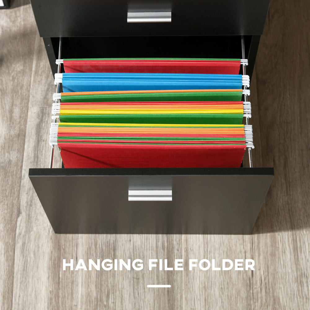 - Three drawers: The top two drawers of the side file cabinet can store your papers, work, stationery and more - keeping everything you need close by. The bottom drawer can be used for hanging A4 files.