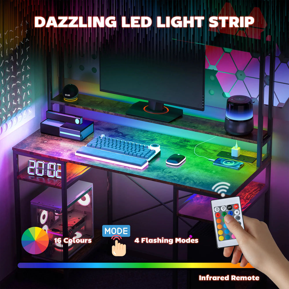 Transform your workspace with the HOMCOM computer desk with storage, designed for both style and functionality. It features a built-in charging station with two power outlets and two USB ports, keeping your devices powered up and organised. Customise the ambiance with RGB LED lights and enjoy the ergonomic monitor stand that promotes comfort with lots of storage options, including shelves and CPU stands. This HOMCOM writing desk helps you keep your home office or study area tidy and efficient.