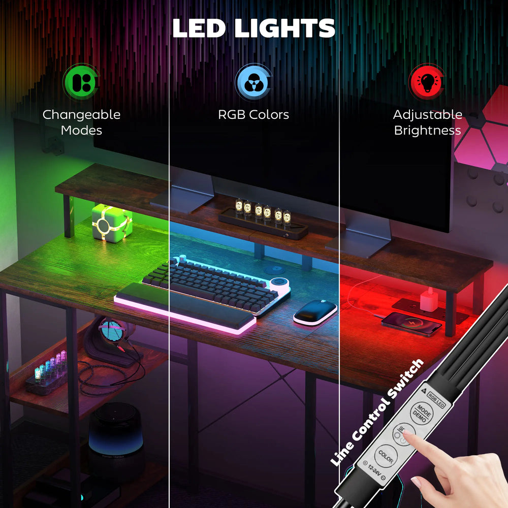 HOMCOM LED Computer Desk, with Power Outlets and Shelves - Rustic Brown
