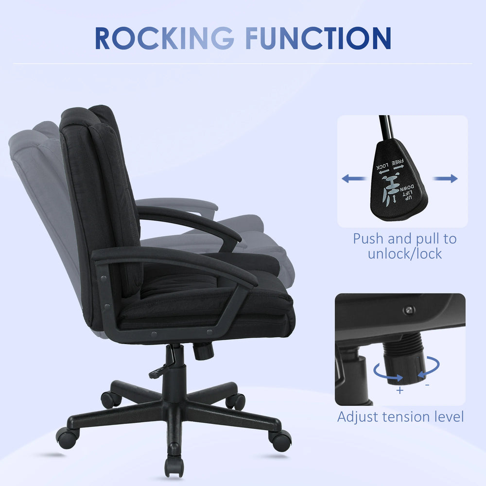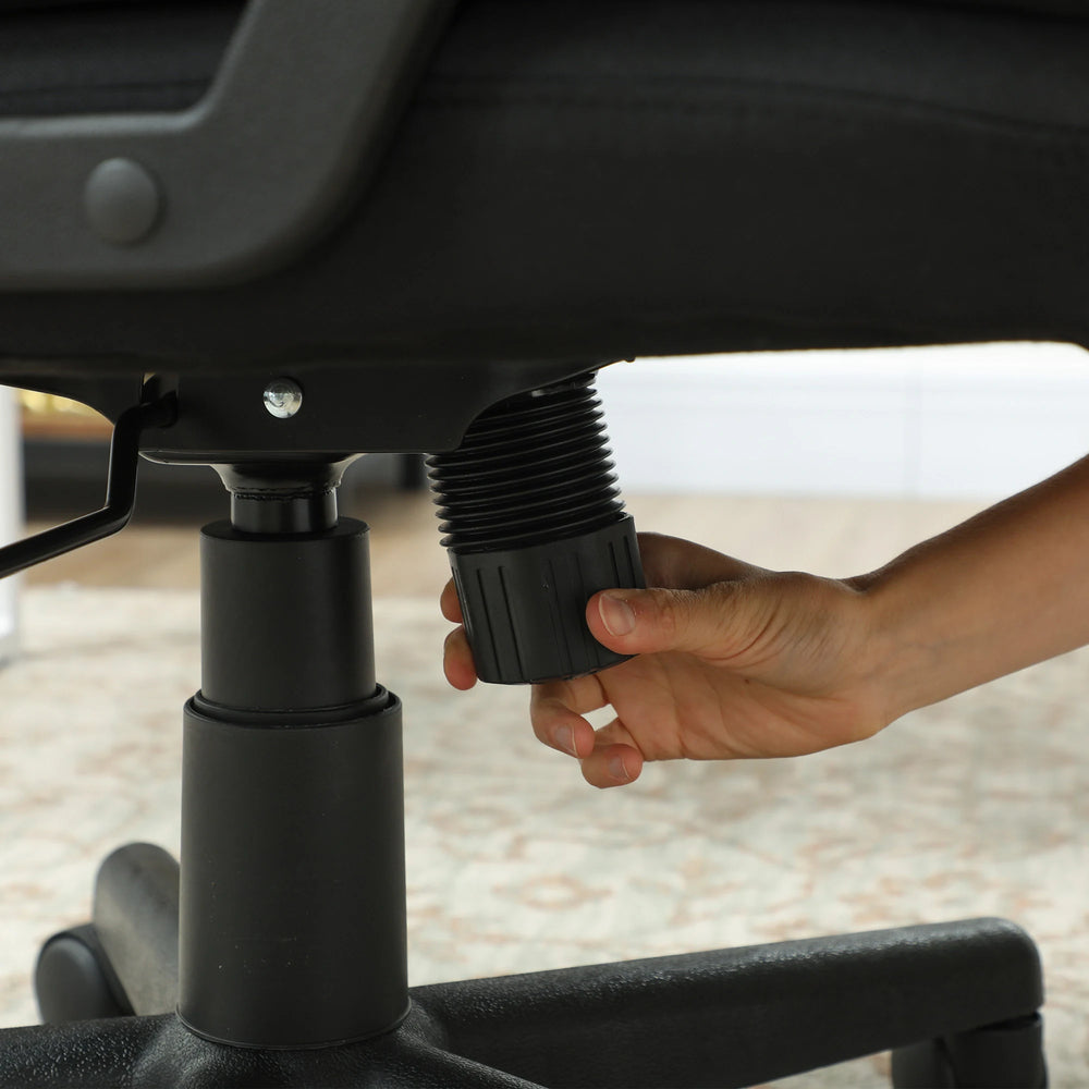 This HOMCOM office chair is a great addition to any home office. A comfy chair: filled with foam padding, with a high back, fixed armrests and adjustable height for support. Five 360 wheels allow this chair to be moved around easily, whenever, complete with a swivel seat which moves in motion with your body.