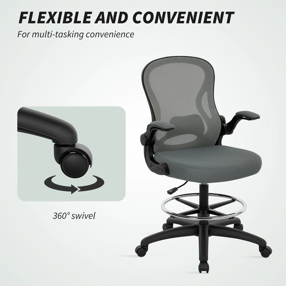 Vinsetto Drafting Chair, Ergonomic Tall Office Chair with Flip-up Armrests, Mesh Back, Lumbar Support, Adjustable Height and Foot Ring, Swivel Wheels, for Standing Desk, Charcoal Grey