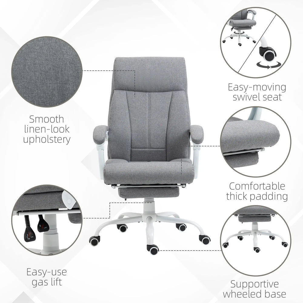 Your long work day calls for this Vinsetto office chair. Relax and recline into an angle you want, thanks to the 155 reclining back and manual footrest. Thick padding for comfort, the linen-look upholstery is soft on skin. Adjust the height between 111cm and 119cm: set to a working level best for you. Comfort and functionality - this home office desk chair does both.