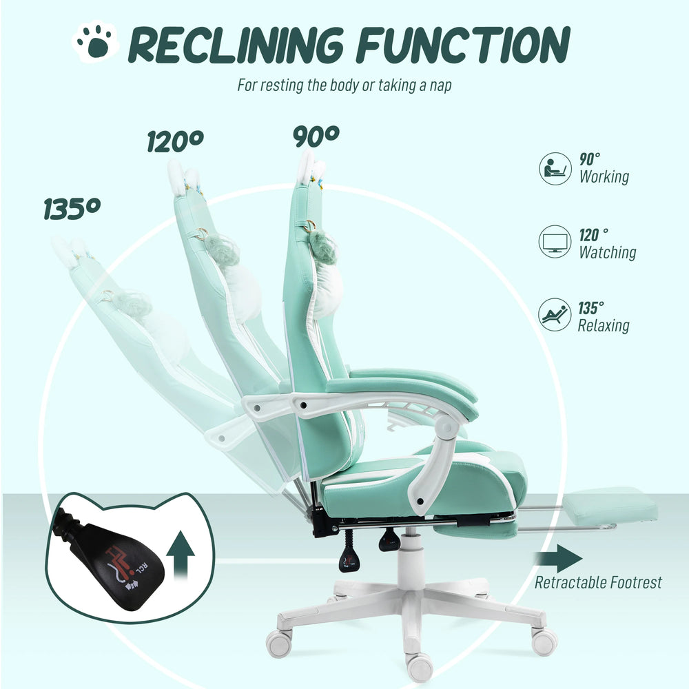 Focused on the game, in cat style with this HOMCOM gaming chair with footrest. It's decorated with cat ears and paw for a cute look. The medium-density foam padding keeps you comfortable, with a high back and armrests for support. Adjust seat height between 44-52cm to game at a position for you. Enjoy the freedom to recline up to 135, complete with the retractable footrest to elevate the lower body.