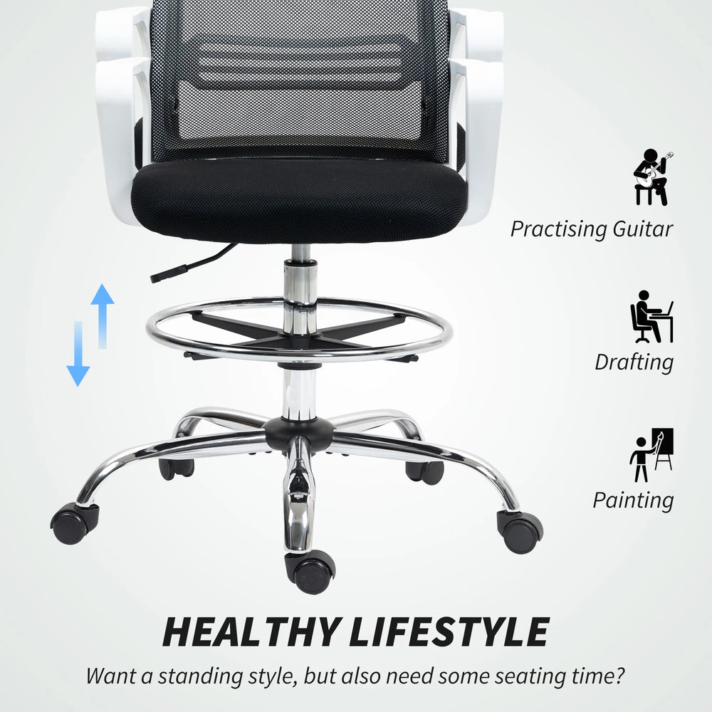 Discover the comfort of the HOMCOM Draughtsman Chair, featuring an adjustable seat height for tailored positioning. This high office chair includes a foot ring for added support and a breathable mesh cover with lumbar support to keep you cool and comfortable. Suitable as a perching stool or workshop stool, it's the smart choice for any workspace.