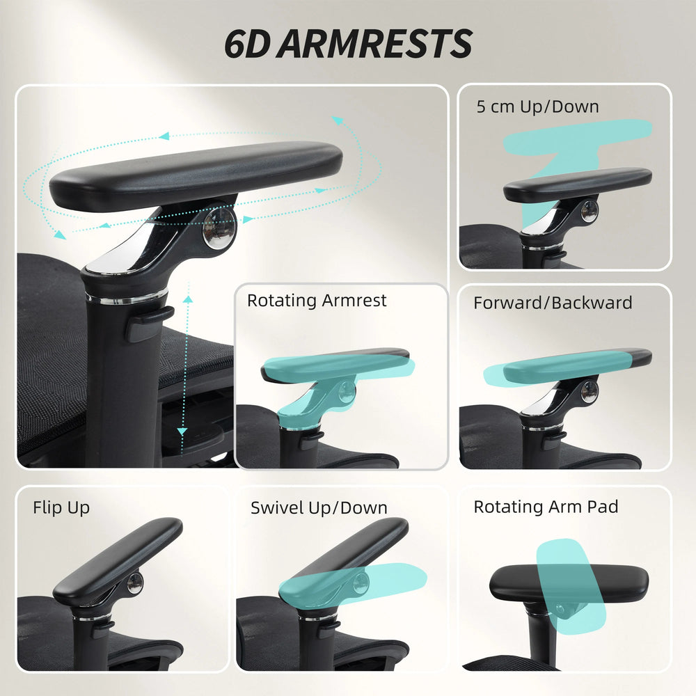 - 6D armrests: This desk chair features fully adjustable armrests5cm up/down, forth/back, swivel up/down, rotating armrest rod, rotating arm pad, or flip up to free space when not in usekeeping your arms and shoulders supported while maximising workspace