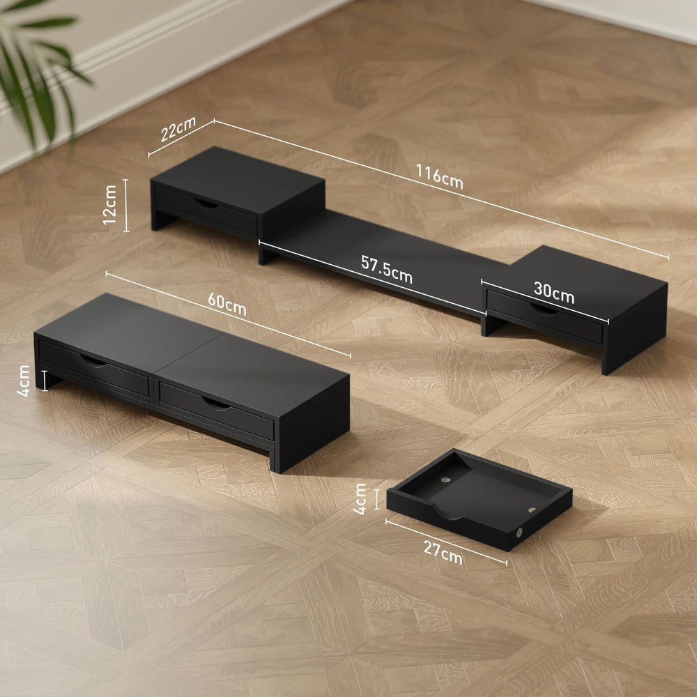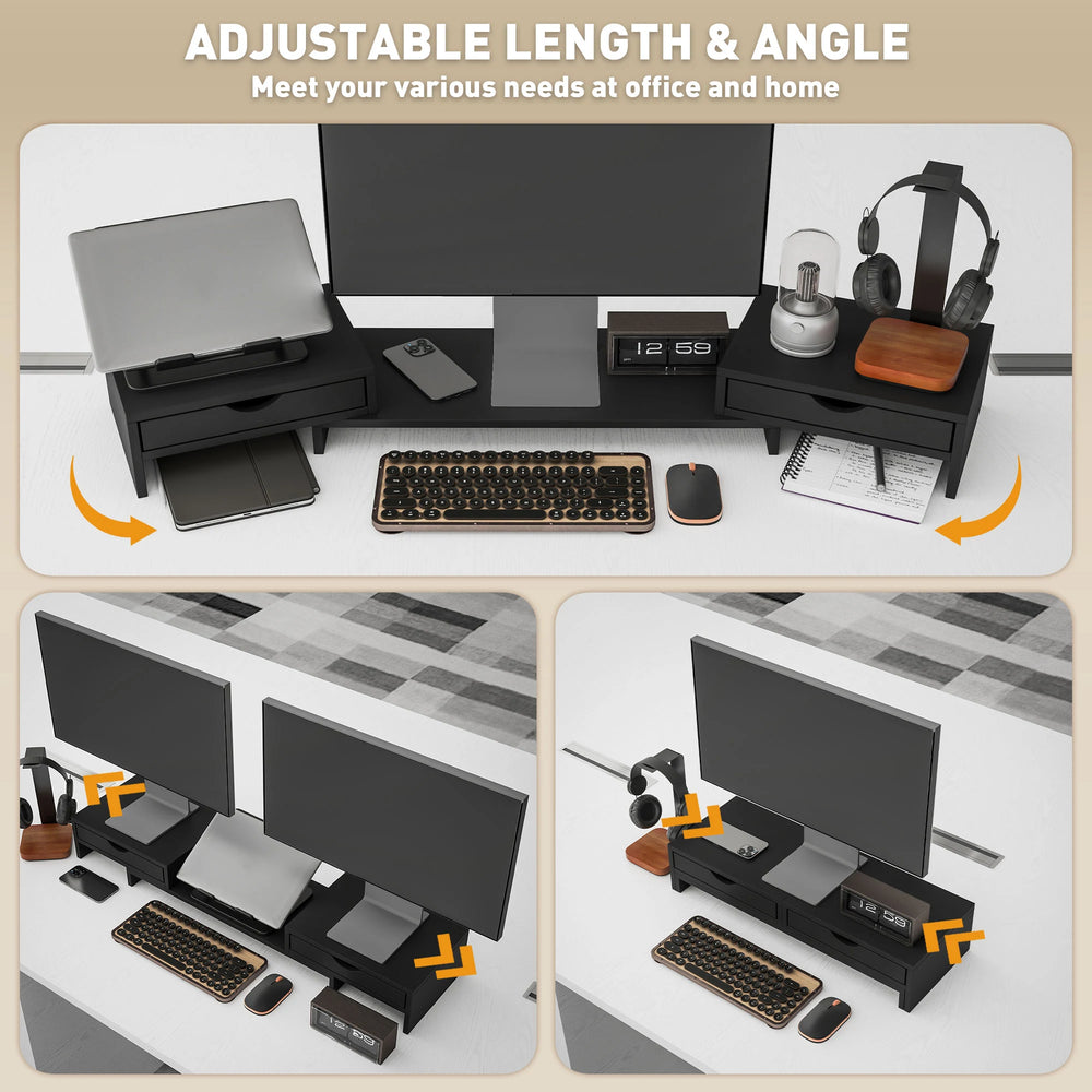 HOMCOM Dual Monitor Stand Riser with 2 Drawers, Adjustable Length and Angle, 116cm Monitor Riser for Laptop, Computer, PC, Small Printer, Black