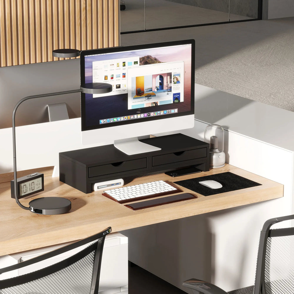 - Organised storage solutions: Equipped with two drawers and three additional space beneath, this desk stand offers lots of room for storing office essentials and peripherals