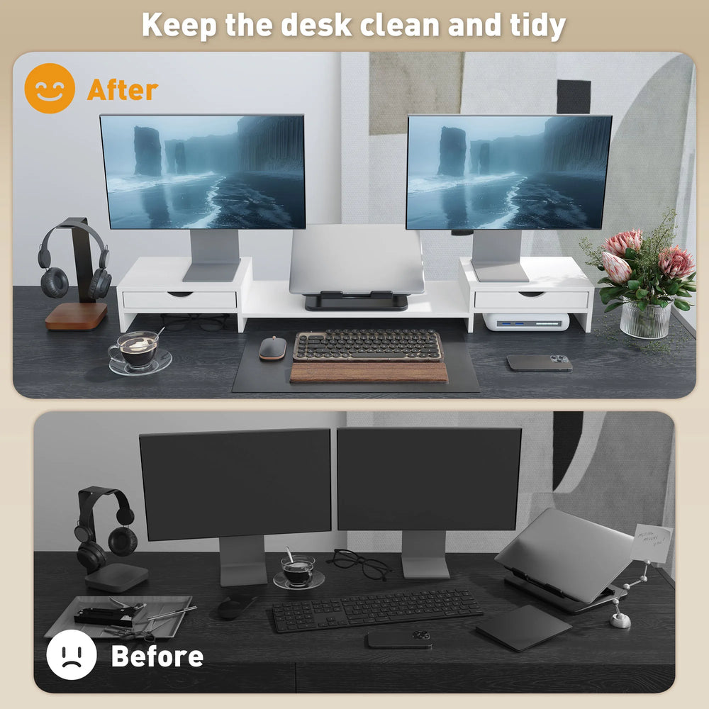 - Organised storage solutions: Equipped with two drawers and three additional space beneath, this desk stand offers lots of room for storing office essentials and peripherals