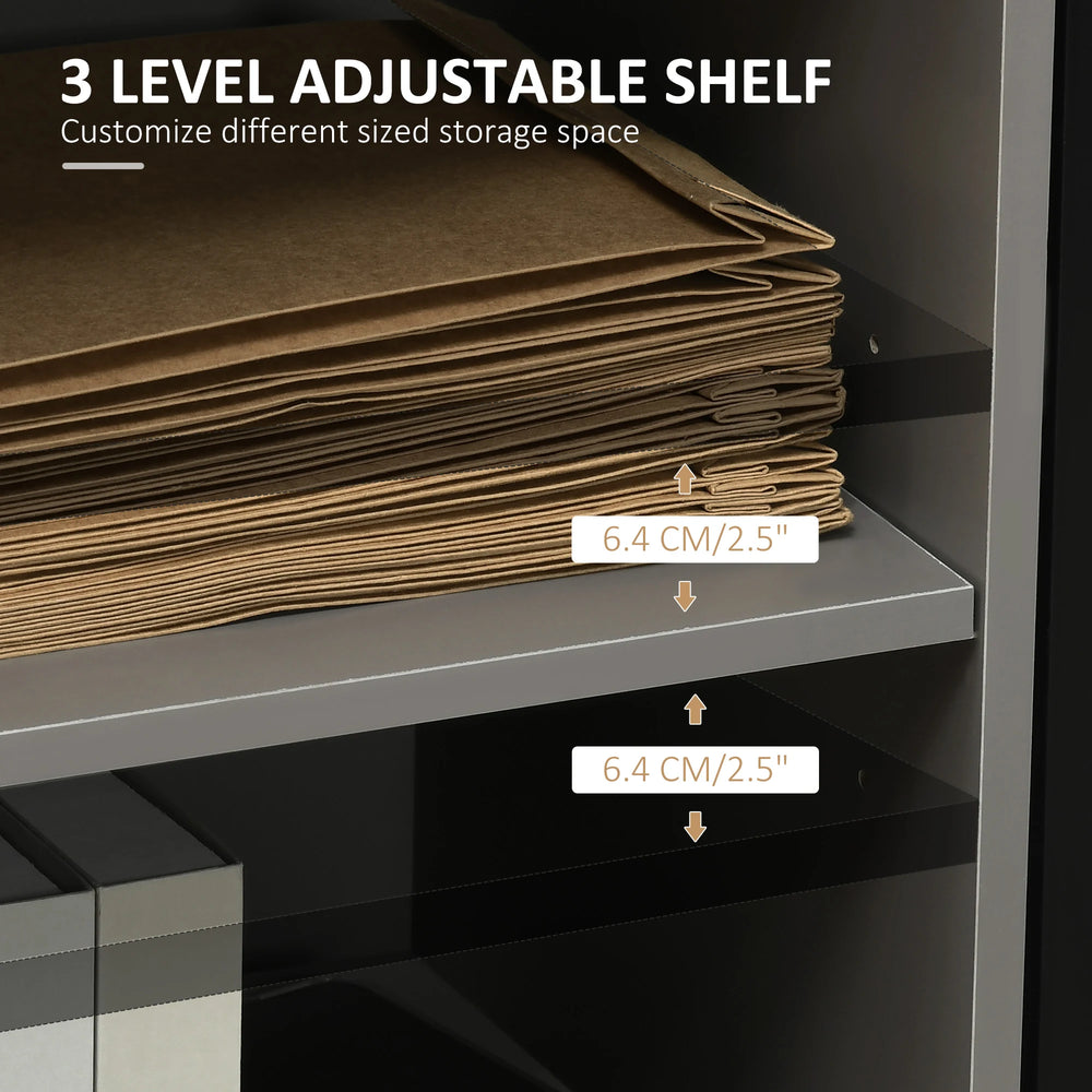 Give your office style and storage all at once with this cabinet from HOMCOM. It features two open compartments and three drawers, giving you plenty of space to keep files, folders and stationary organized. The shelf on the right can be adjusted to suit your needs. Four castor wheels ensure easy movement, with two lockable to keep stationary. It's made from particle board, ensuring it is tough and durable for everyday use, in a black colour for a sleek addition which sits well-placed anywhere.