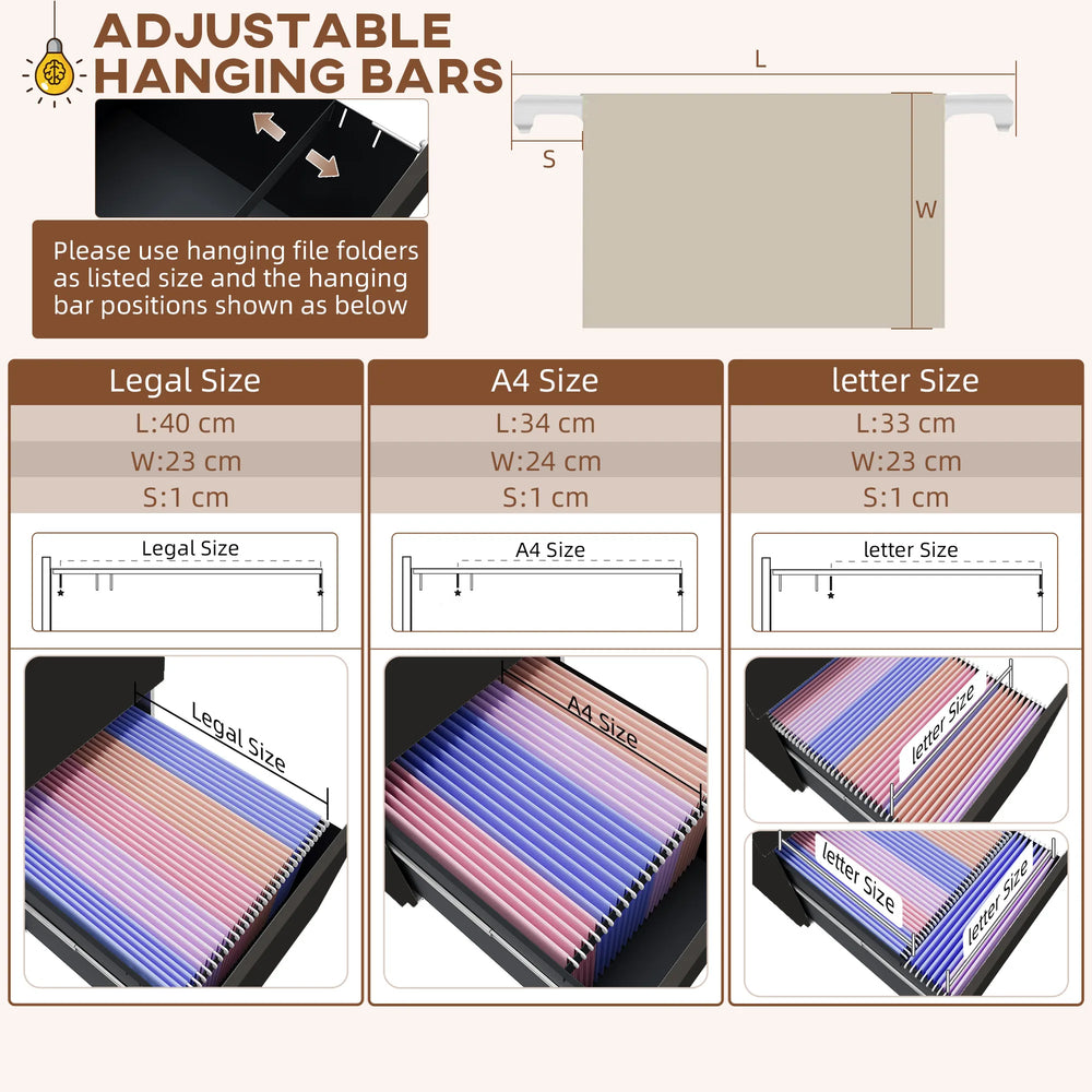 - Adjustable hanging bar in bottom drawer for letter, A4 and legal sized files