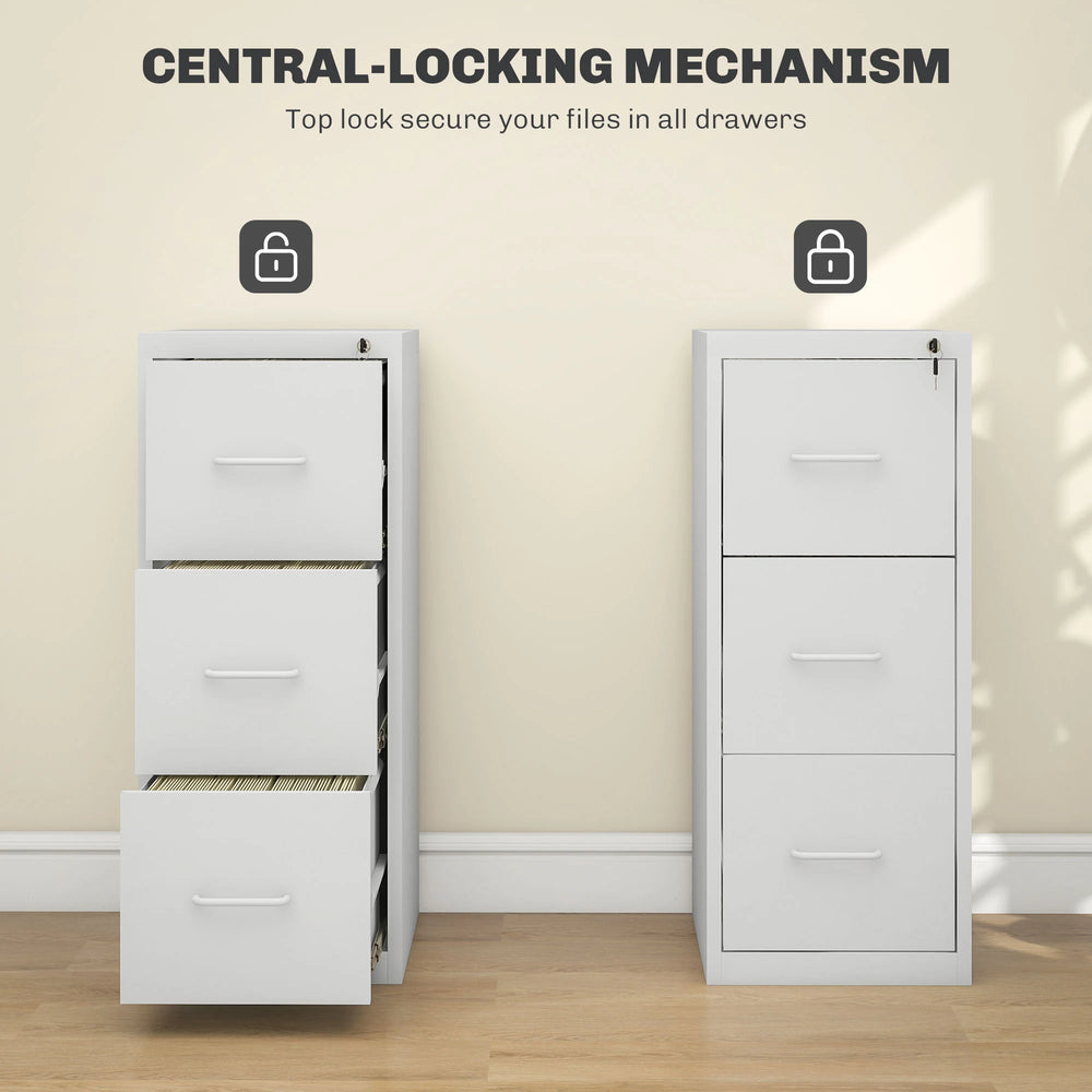 Keep your workspace tidy and organised with this HOMCOM filing cabinet. It features three drawers with adjustable bars for A4 and letter size files - plenty of room for keeping paperwork together. The top centre-locking system ensures locks all drawers simultaneously for security. Enjoy a clutter-free space with a modern touch.