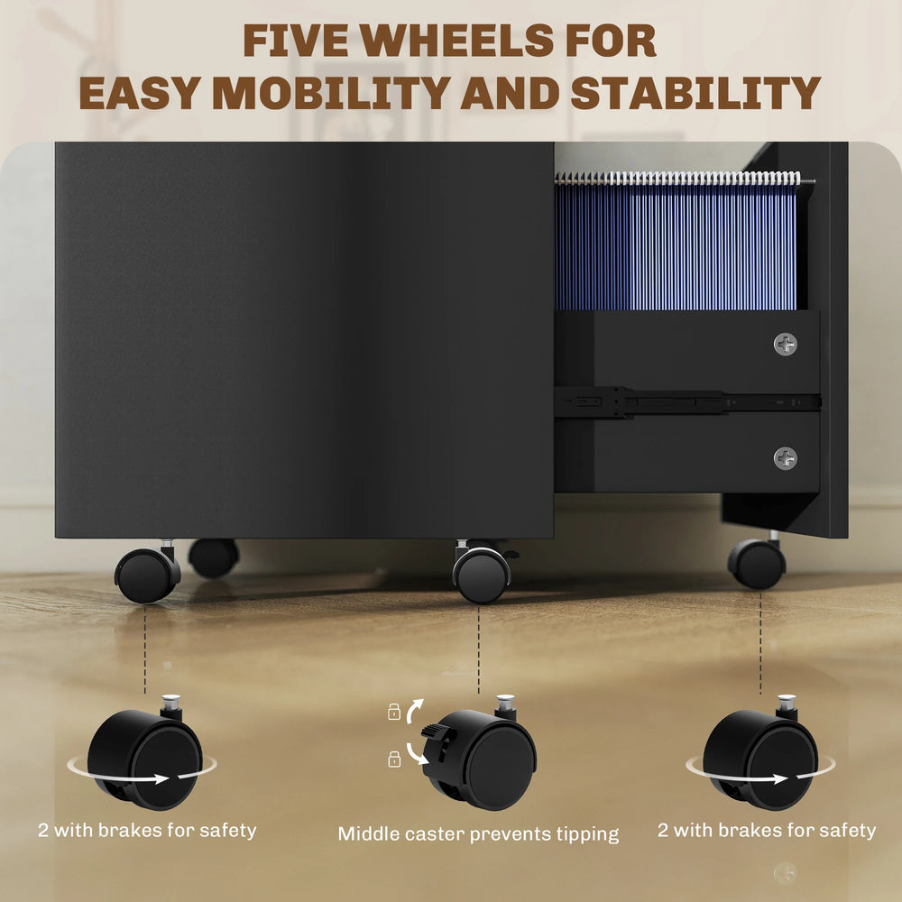 - Five wheels: Small filing cabinet is very easy to move. Two brakes so it stands still, in place.