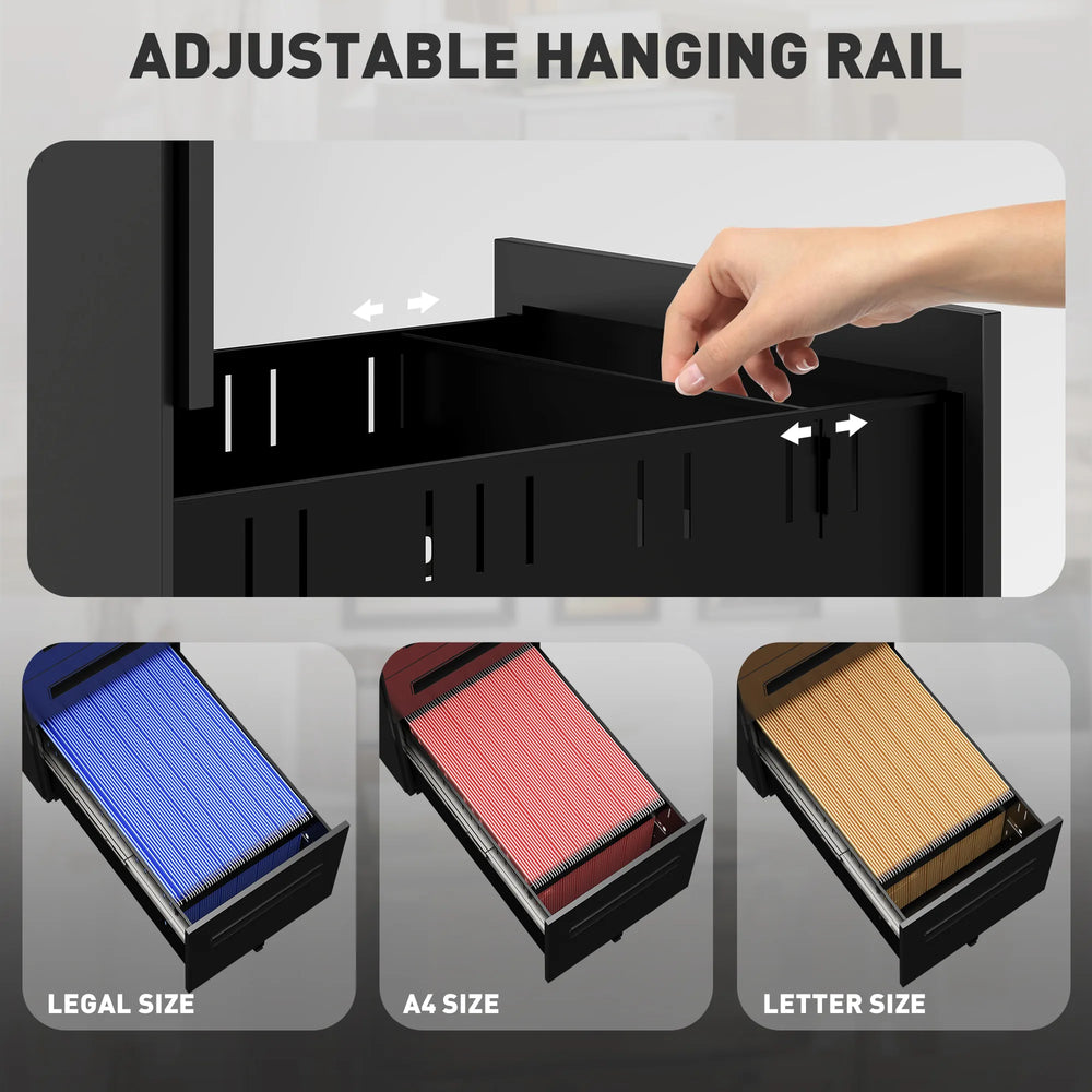 - Three drawers: Two small and one large - under desk drawers offers plenty of room for home office and work essentials. The detachable pencil tray makes it easy to take out stationery in one go. Adjustable hanging rail in large drawer for A4 sized files