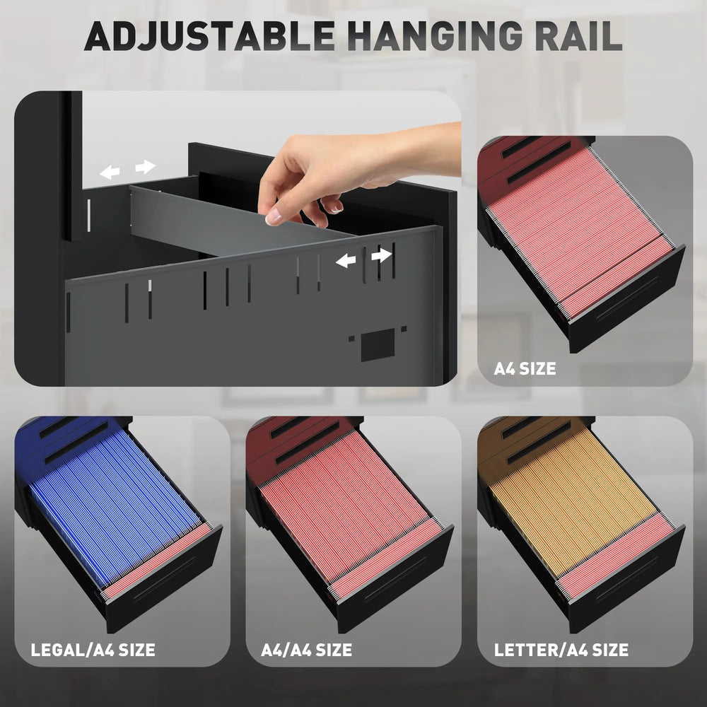 - Three drawers: Two small and one large - under desk drawers offers plenty of room for home office and work essentials. The detachable pencil tray makes it easy to take out stationery in one go. Adjustable hanging rail in large drawer for A4 sized files