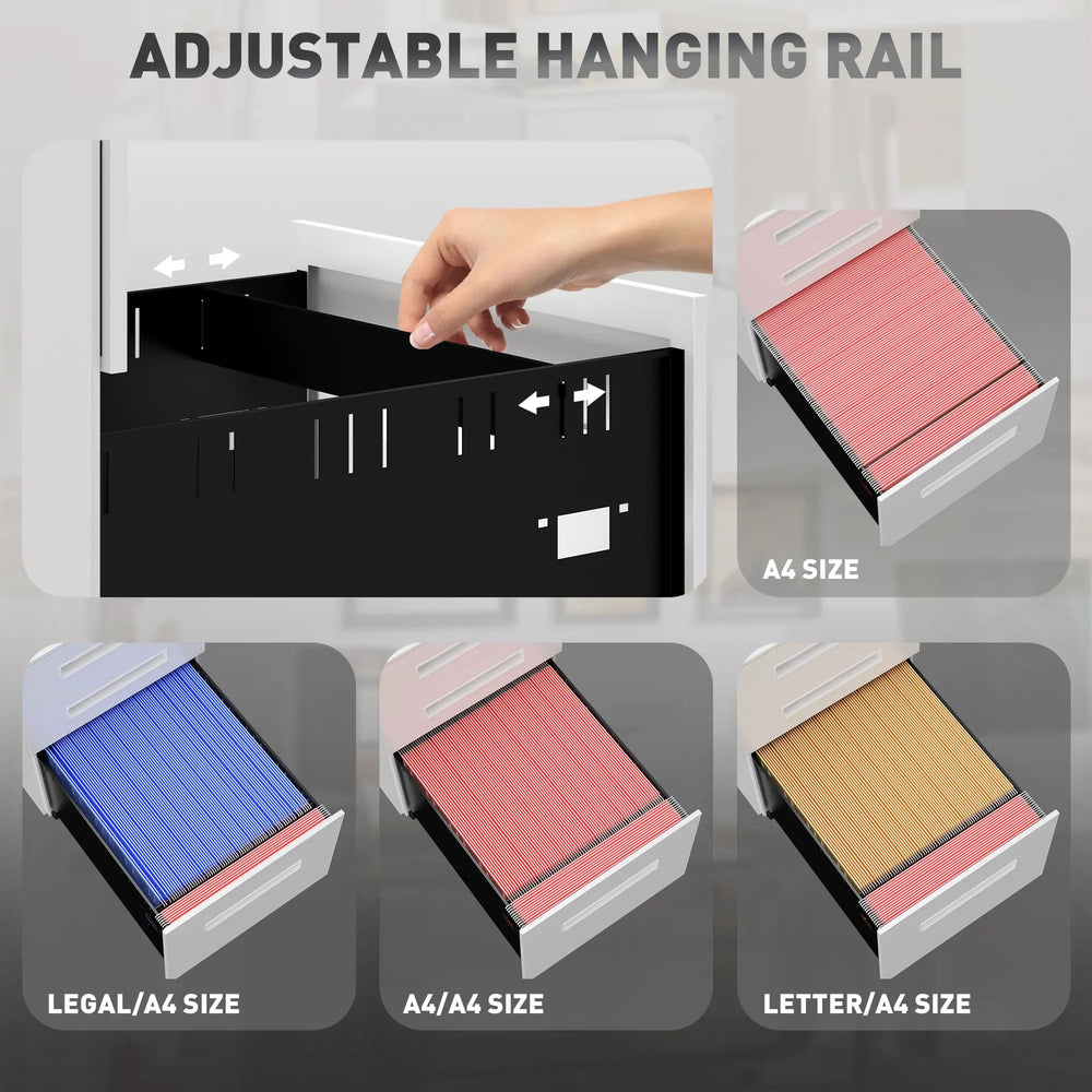 - Three drawers: Two small and one large - under desk drawers offers plenty of room for home office and work essentials. The detachable pencil tray makes it easy to take out stationery in one go. Adjustable hanging rail in large drawer for A4 sized files