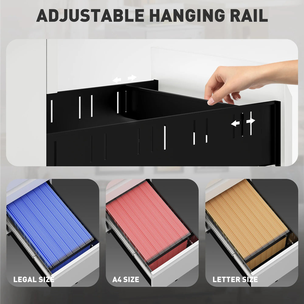 - Tailored to your filing needs: The large drawer is equipped with an adjustable hanging rail, accommodating A4, legal and letter-sized files with ease. Keep your paperwork neatly organised and effortlessly accessibleno more rummaging through piles