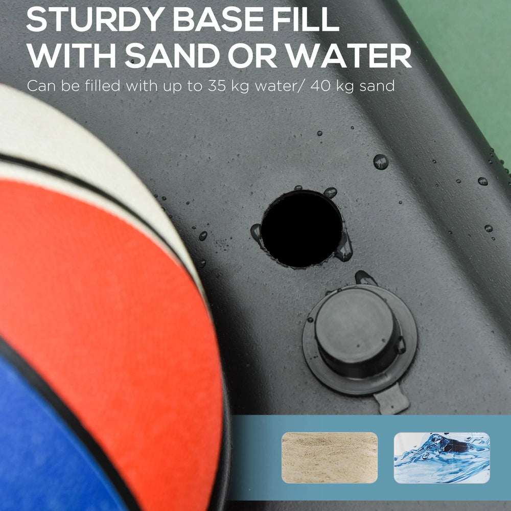 Enjoy shooting hoops with this HOMCOM basketball stand. With an adjustable height, it's suitable for all ages everyone can join the fun. A steel frame for strength and durability, whilst the base can be filled with water or sand, keeping it firmly in place. Wheels at the bottom lets you move the stand with ease, so you can position it properly. Play on your own or with friends and family; either way, you'll enjoy the swooshing sound of the ball passing through the net.