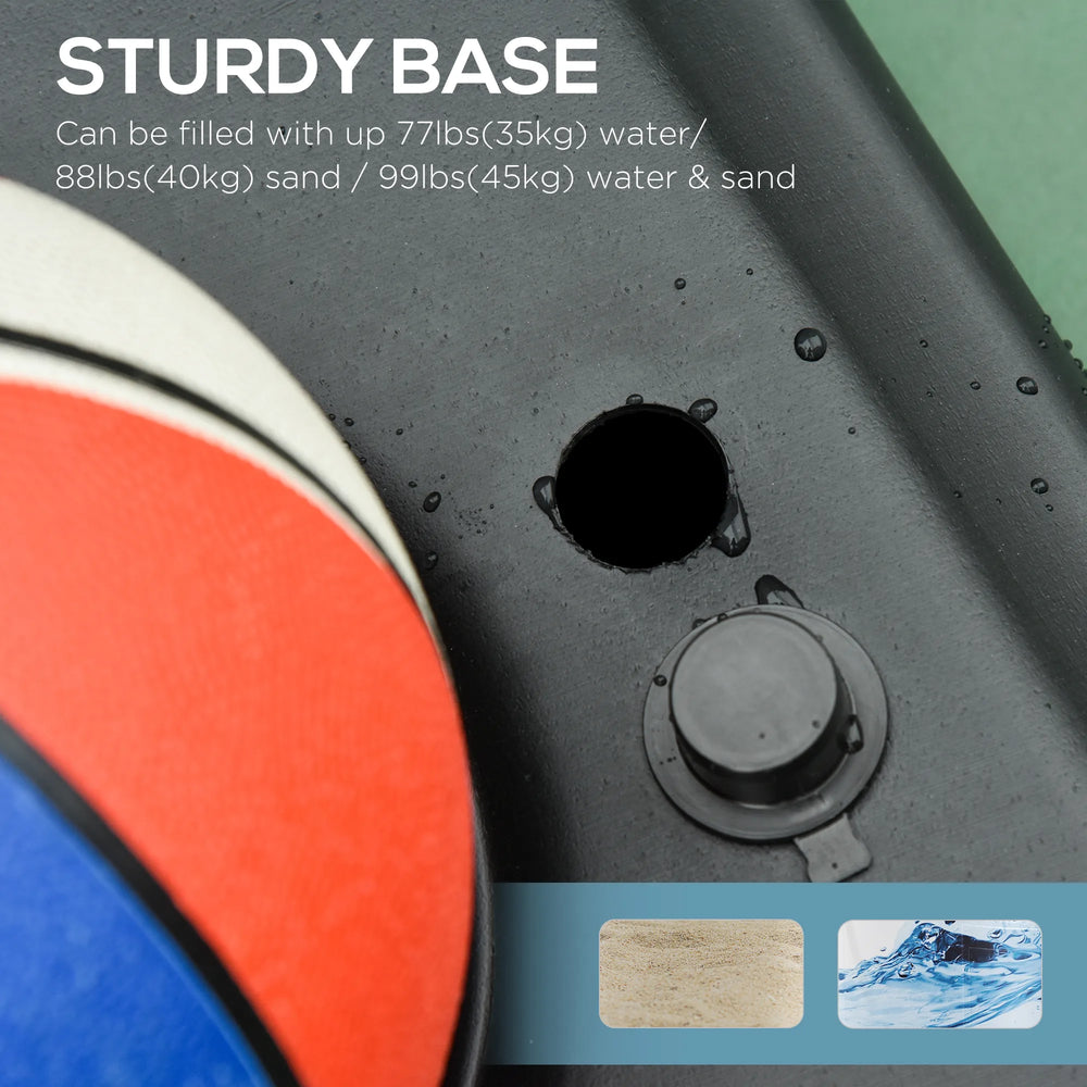 Enjoy shooting hoops with the HOMCOM basketball stand. The solid steel frame is adjustable between 195-245cm, making it suitable for various heights and ages. The hoop is also adjustable between 160-210cm. Fill the large base with water or sand to keep it firmly upright during sessions. It has two wheels at the bottom for easy movement, complete with a ball-holding groove at the back to keep your ball safe and in place when not in use.