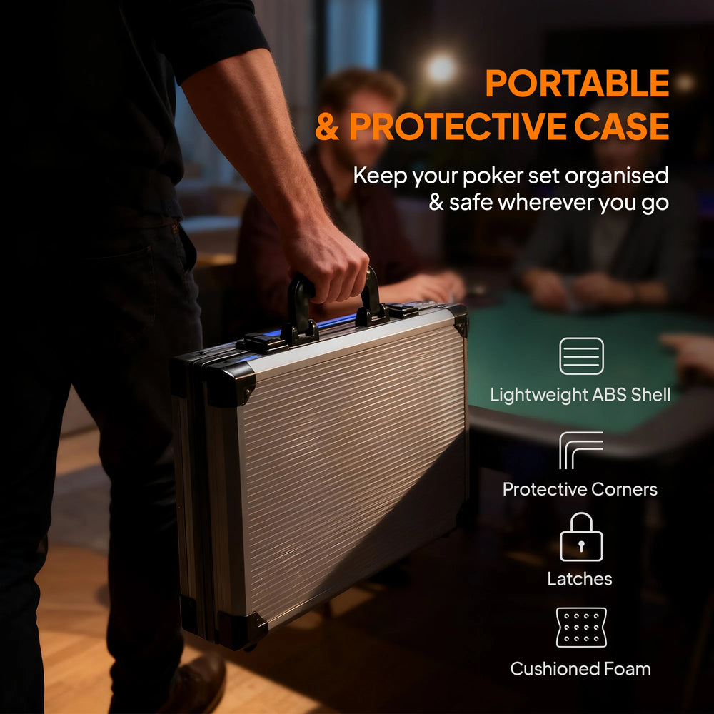 - Protective case: Made of lightweight ABS panels with reinforced aluminium corners. Inside, plastic slots and foam keep poker chips safe. With two latches for security and a handle for easy carrying.