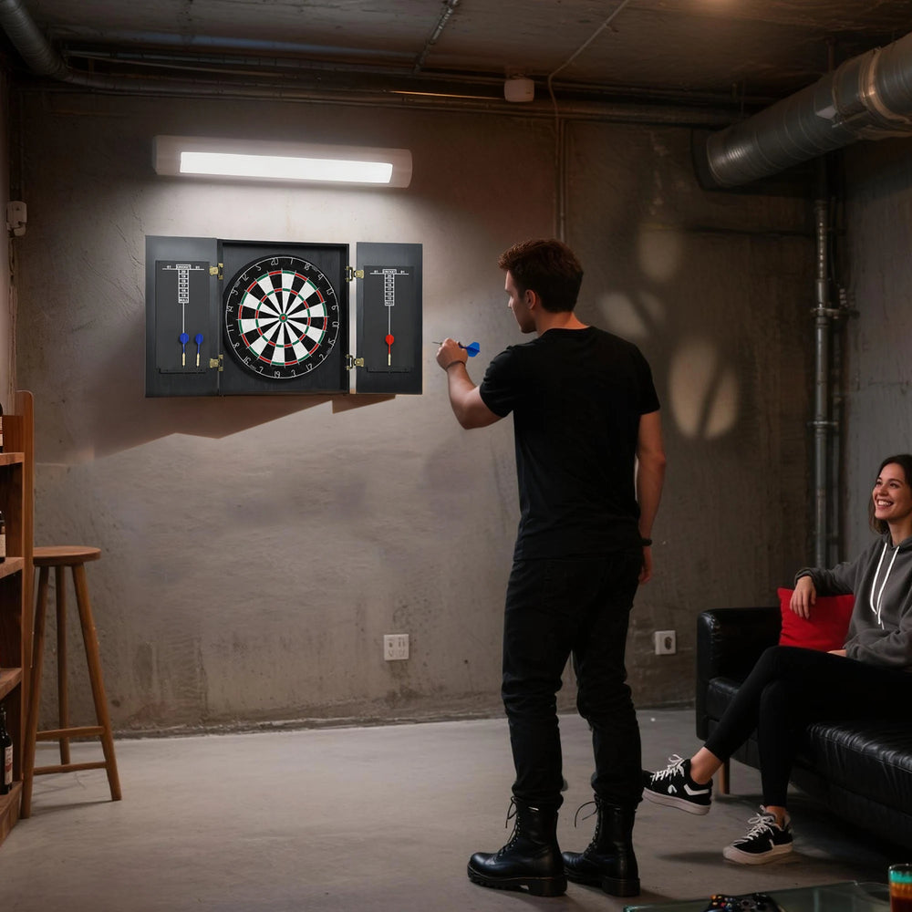 - Complete set includes a bristle dartboard, a cabinet with scoring board and dart holders with six steel-tip darts