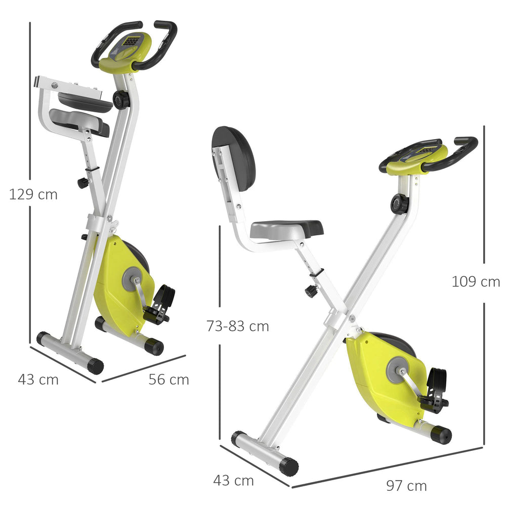 This magnetic exercise bike from HOMCOM. Adjustable to eight different resistance levels to suit you, it is fitted with a five-level adjustable seat. Suitable height from 155-180 cm. An LCD monitor is placed on the front of the cycling machine, which displays time elapsed, speed, distance, calories and heart rate (measured by the metal panels on the handlebar). An 'X' shaped metal frame for strength and stability of the indoor exercise bike, it can be folded for easy storage when not needed.