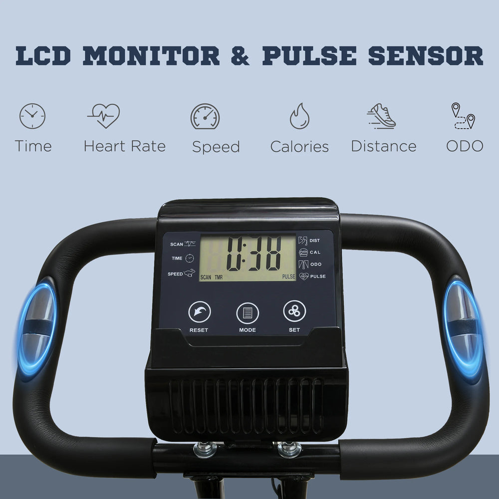 Enjoy a complete cardio workout with the HOMCOM indoor exercise bike. Great for home use, it features an LCD monitor that tracks time, speed, distance, heart rate and calories burned to help you achieve your fitness goals. Use it as an upright or recumbent bike, plus take advantage of the tension ropes to strengthen your biceps. The phone holder keeps your device nearby so you can watch videos, play music and more while you exercise. When you're done, simply fold the bike for easy storage.