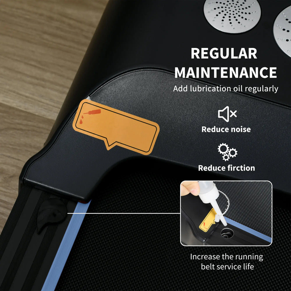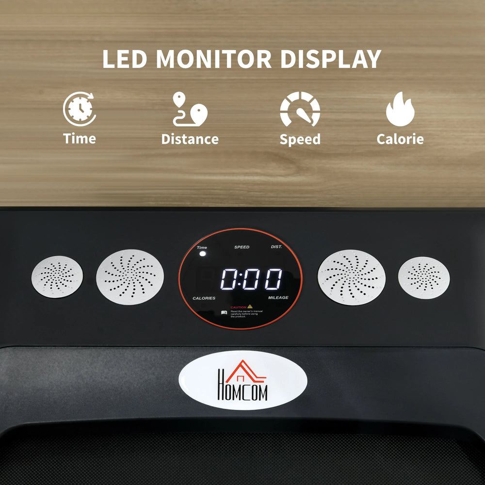Boost your step count without leaving home with the HOMCOM walking treadmill. The built-in LED screen helps you monitor time, speed, distance and calories, keeping you on track with your fitness goals. It features a non-slip running belt for safety and a safety key that allows for quick stops if necessary. With two wheels at the bottom, it's easily portable, making it convenient to move wherever you need. Enjoy an effective and safe workout right from the comfort of your own home!