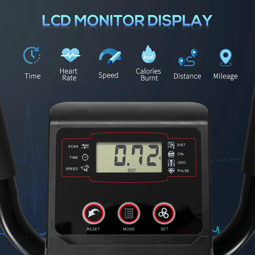 - LCD monitor: Displays time, speed, calories, distance, mileage and heart rate to keep track of your workout. This elliptical cross trainer also has a built-in holder to place your phone or tablet.