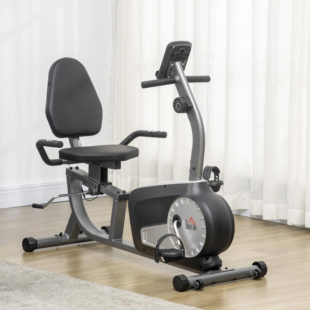 Optimize your home fitness routine with this semi-recumbent exercise bike, great for enhancing fitness, boosting cardiovascular endurance and muscle toning. Featuring adjustable resistance across 8 levels, customisable seat and backrest, ergonomic handlebars and a multifunctional LCD screen, the indoor bike offers a tailored and unique workout experience.