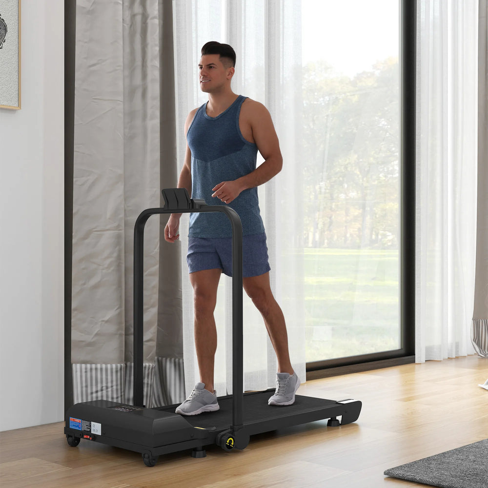 Get fit with the versatile HOMCOM treadmill, designed for running and walking. Keep the handle upright for running mode (1-10km/h), then fold it down for walking mode (up to 6km/h) and use it under a table or desk. The LED screen shows time, speed, distance and calories burnt to help you track your goals. Compact and smooth, transform any corner of your home into a mini fitness centre, with minimum noise!