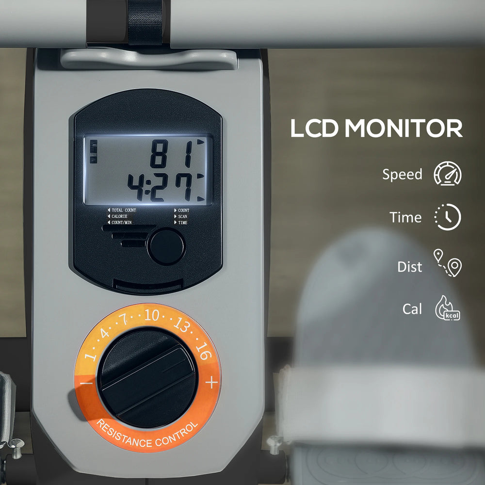 - LCD monitor: The clear LCD monitor on our rowing machine displays time, distance, speed and calories, keeping goals in sight. A built-in phone/tablet holder lets you stream music, shows, or workout apps - so you row harder without even noticing the time.