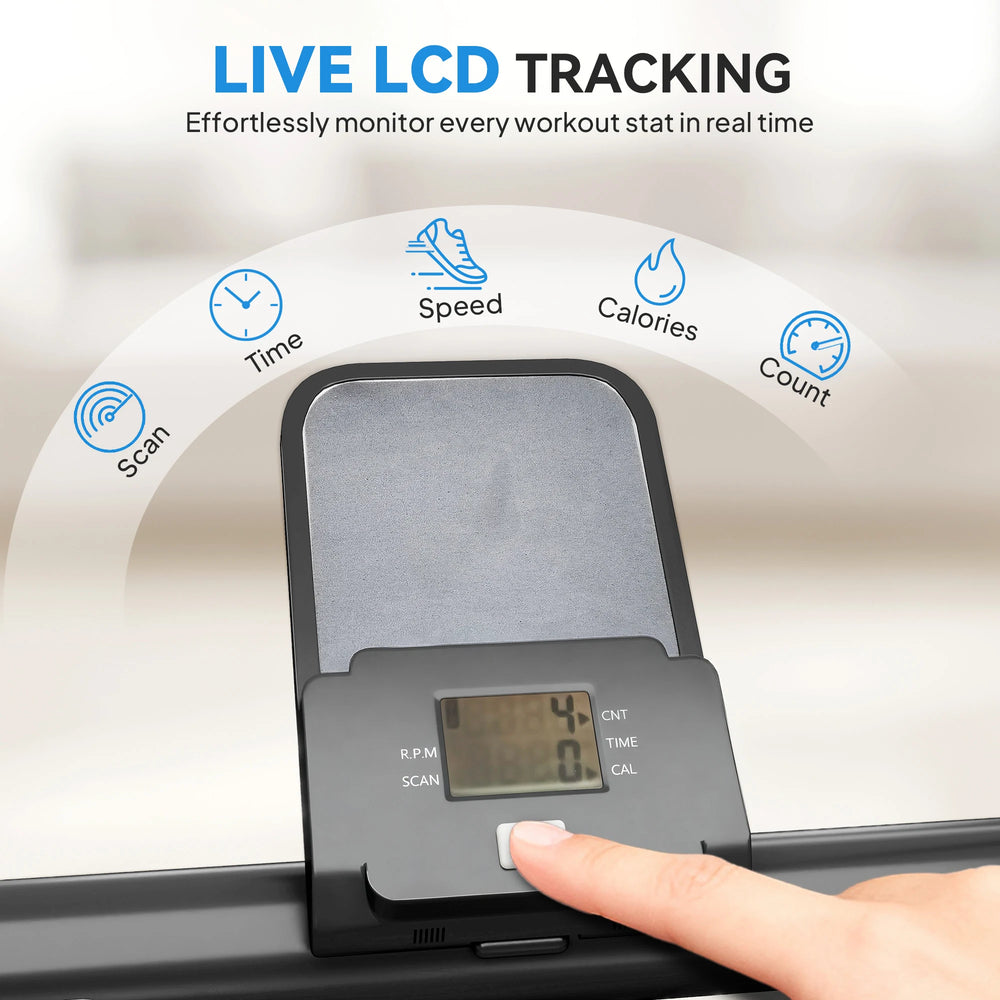 - An LCD monitor shows time, speed, calories and steps to track your progress