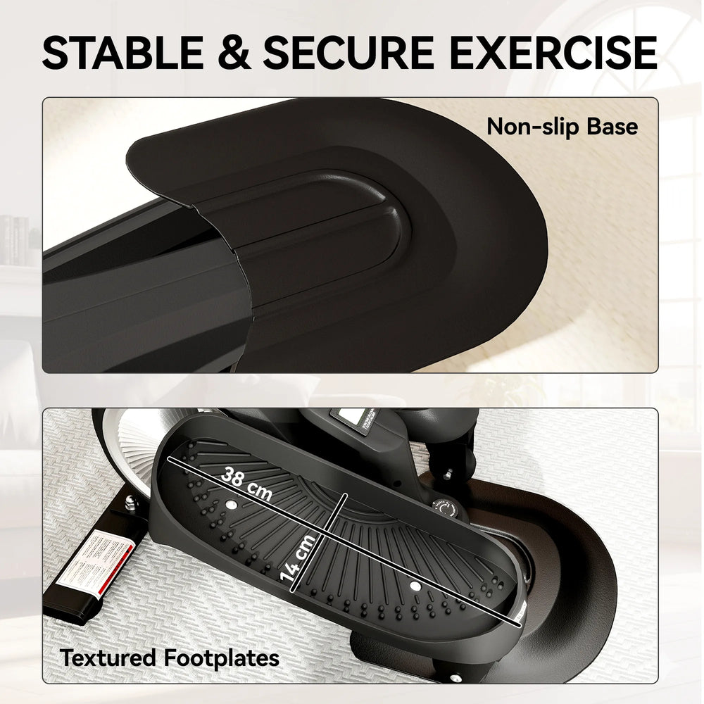 - Compact and portable design: The mini elliptical's lightweight body and built-in handle make it effortless to move or store; it slides neatly under your desk or sofa, suitable for small homes or office use. Dimensions: 60L x 43.5W x 29H cm.