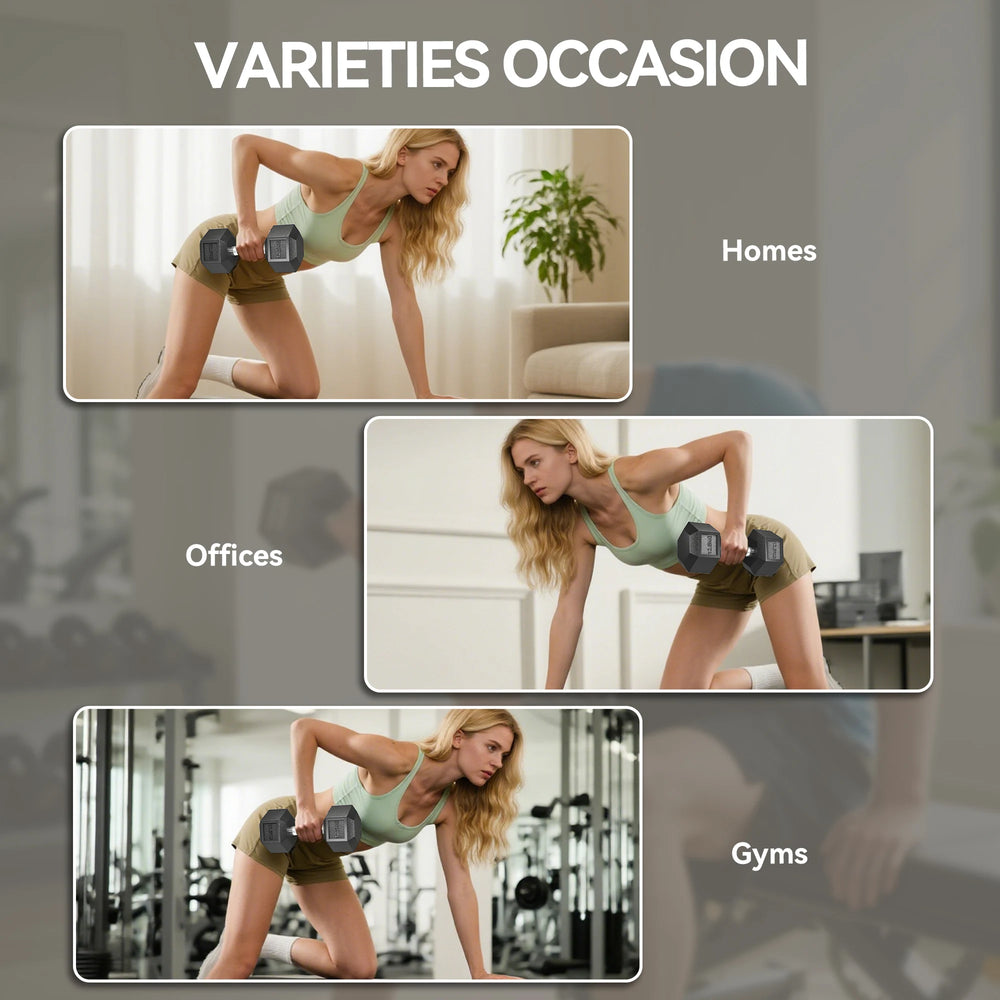 - Rubber covered ends for safety when dropped, hexagon shape stops weight rolling