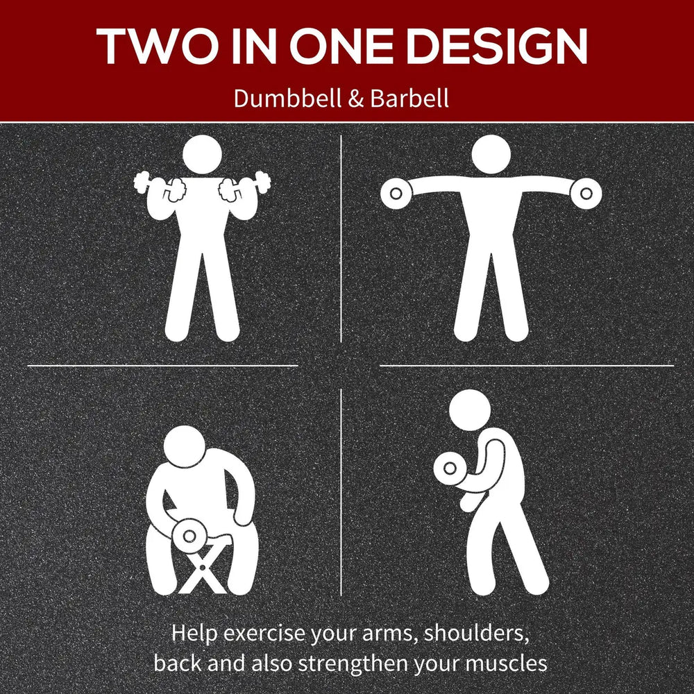 Elevate your fitness journey with the versatile HOMCOM two-in-one dumbbell set, designed for those passionate about strength training. Seamlessly switch between dumbbells and a barbell to diversify your workouts at home. With 12 plates and 3 rods, customize the weight to match your fitness level, whether you're a beginner or an expert. Perfect for a range of exercises, from bicep curls to squats, this set empowers you to achieve your fitness goals with ease and precision.
