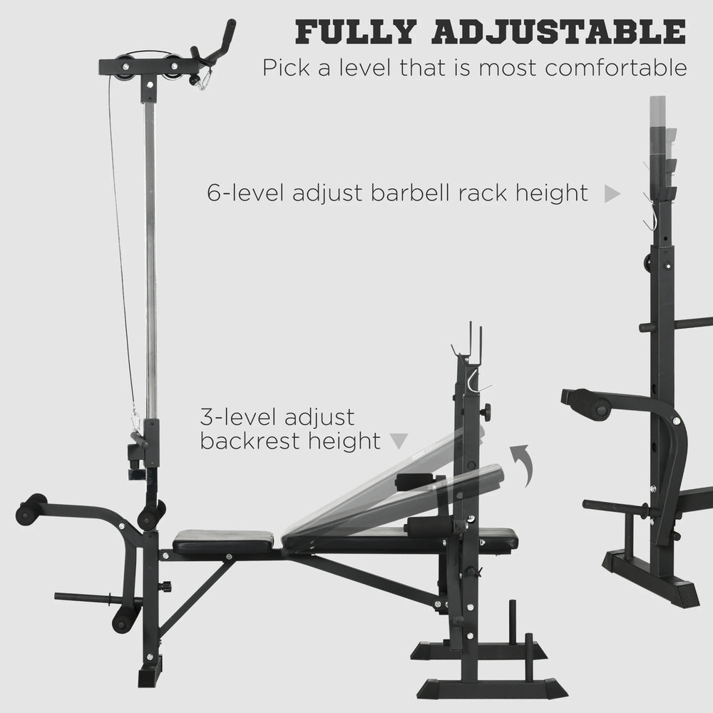When the size of your home gym is limited, you need a more comprehensive capacity of workouts in your space! This HOMCOM's multi-station exercise bench will target numerous muscle groups for full-body strength training in a piece of equipment. This high-level fitness bench features a high pulley, butterfly curl, leg curl, bench press and a barbell rack. Our flat bench features a soft seat and back made with sweat and odor-free fabric, so your workout will feel good in multiple ways.