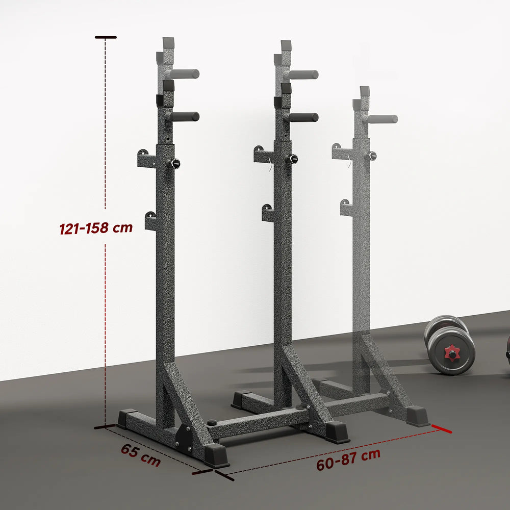 - Adjustable height: The twistable knobs let you change the height in 9 levels between 121-158cm and width between 60-87cm. You'll have this squat rack at a tailored height, so you can exercise comfortably.