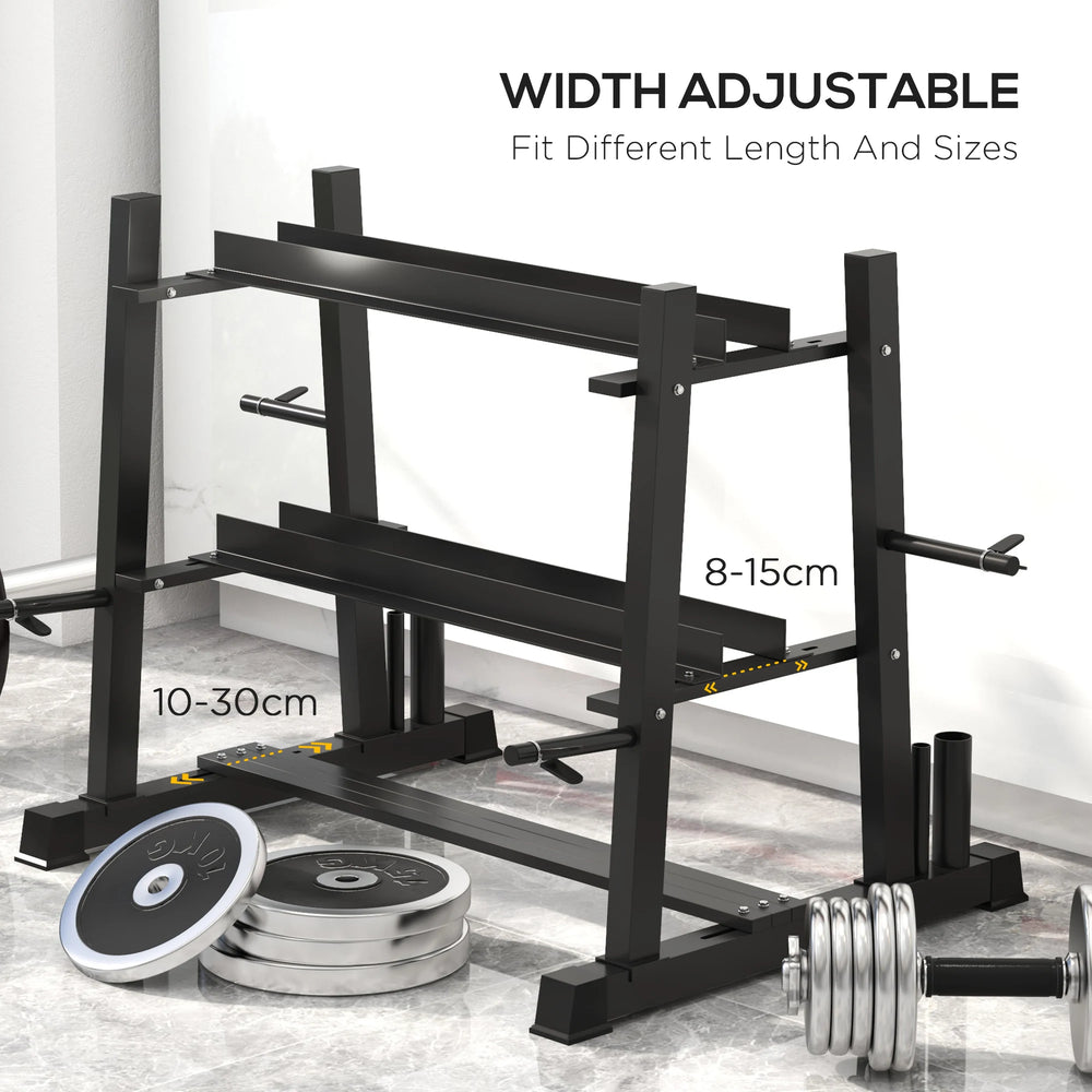- Adjustable assembly: Tailor the spacing between the bars to fit the length and dimensions of your dumbbells and kettlebells. The bottom tier of the weights rack is specially designed to securely house kettlebells.