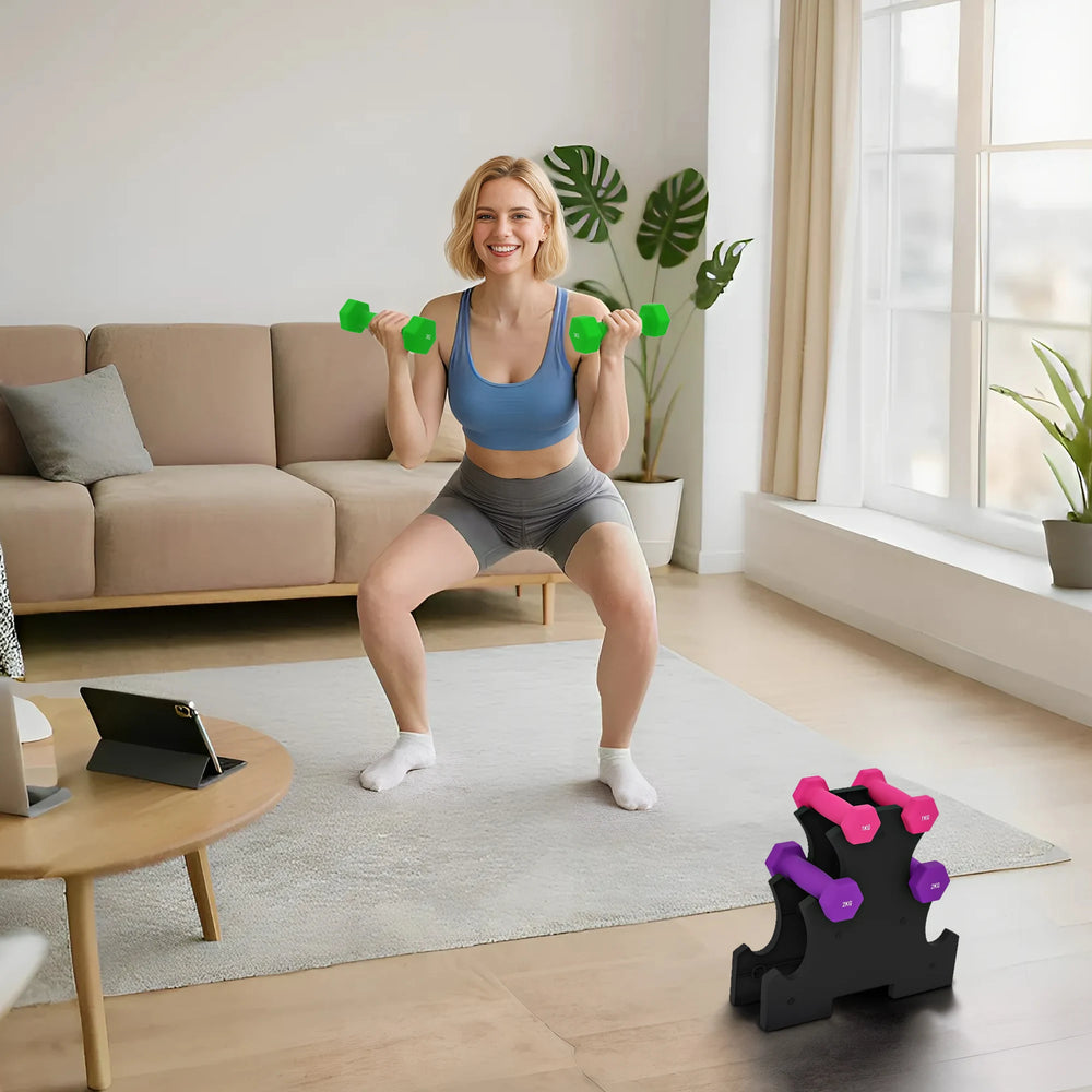 - Complete weight set: Includes a comprehensive dumbbell set for six weights (two 3kg, two 2kg and two 1kg), along with a rack for easy storage great for home gyms. Comes with a rack stand for storing the weights, keeping your space tidy and organised.