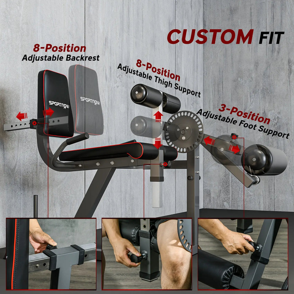 An all-in-1 leg day is a single machine away with the SPORTNOW leg machine. Do leg curls, extensions and glute bridges, all at a home gym. This curl and leg machine creates a comfortable workout, adapting to your build via 8 backrest and 6 leg pad positions. With comfort creating safety, you can lift heavy as you reach 60 kg whether you have standard or Olympic weights. A pin on the back offers a place to store plates on a leg machine all your own. Score big with SPORTNOW.