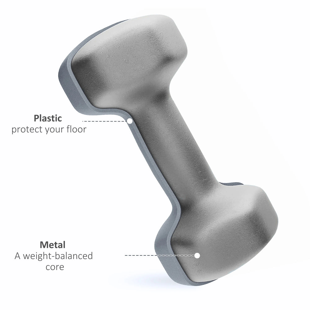 - Strong material: Each dumbbell is covered in plastic to protect your floor, while the solid metal core ensures balanced and reliable lifting.