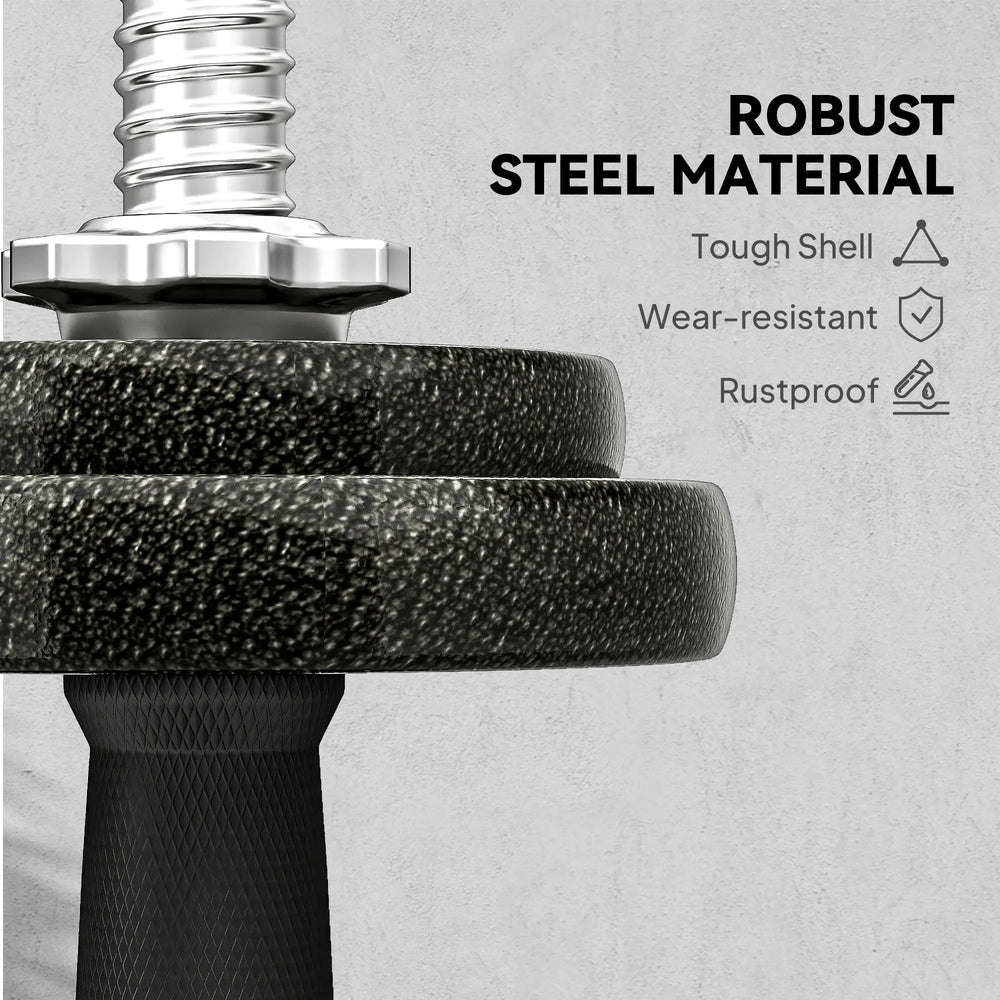 Upgrade your home gym with the SPORTNOW adjustable dumbbell and barbell set. Featuring 20 kg of total weight, this set includes 4 x 2.5 kg and 4 x 1.25 kg plates, two dumbbell bars, a barbell bar and four secure spinlocks. The knurled steel handles provide a firm, anti-slip grip, while the robust, solid steel plates ensure long-lasting use. Easy to assemble and compact for storage, it's great for beginners and strength trainers alike.