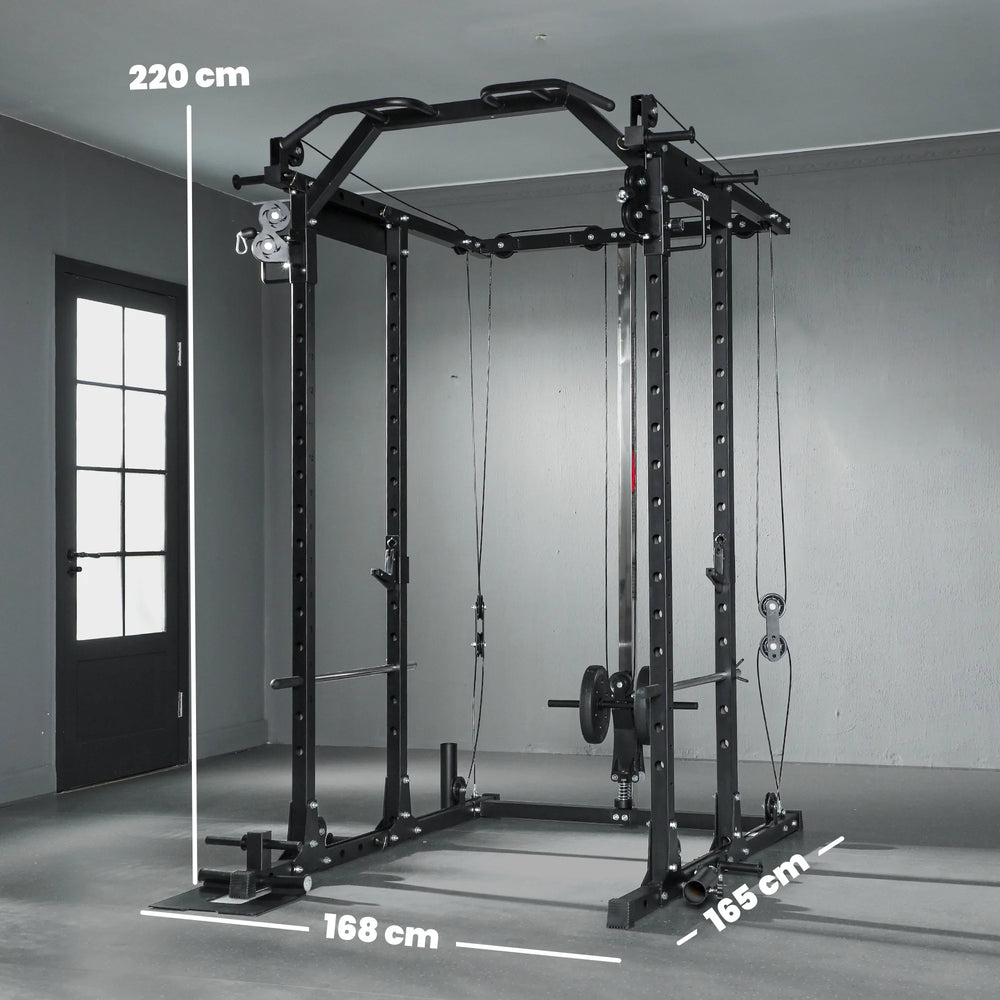 - Spacious and organised: The power rack allows for smooth side-to-side movement during training. Built-in plate and storage features keep equipment tidy and minimise post-workout clutter. Dimensions: 220H x 168L x 165W cm.