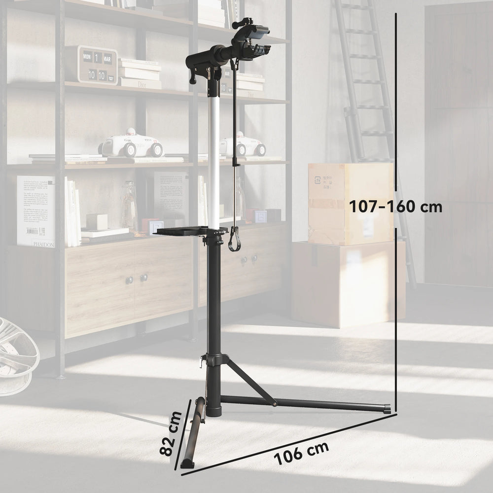 - Adjustable bike stand: Easily adjust the height from 107-160cm. The 360 clamp lets you access every part of your bike, while the grab bar securely locks handlebars and frames in place.