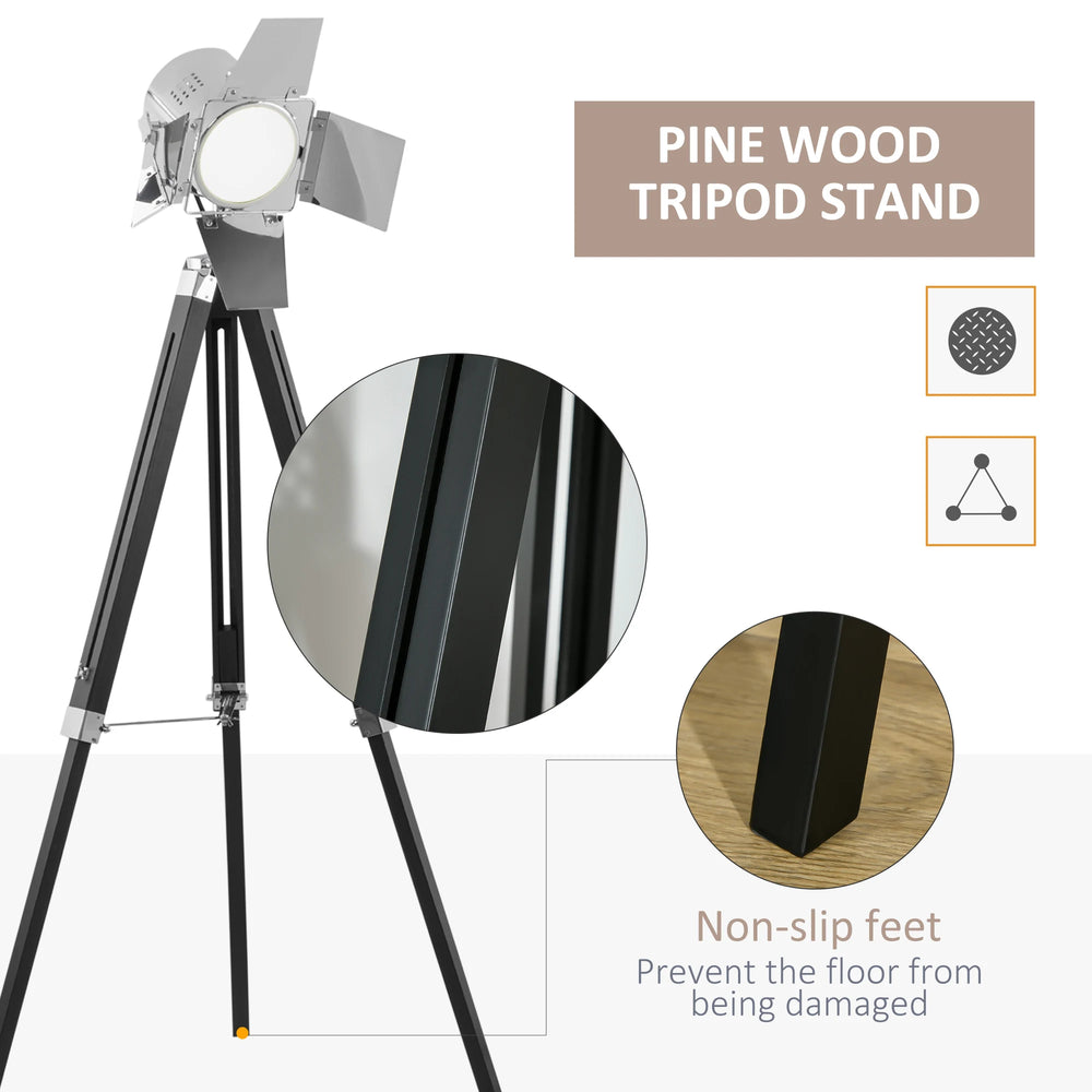 HOMCOM Industrial Tripod Floor Lamp, Nautical Cinema Standing Spotlight with Wood Legs and Adjustable Height for Living Room, Bedroom, Black and Silver