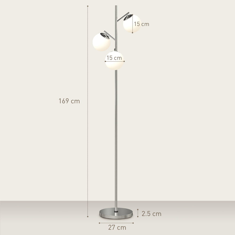 HOMCOM 3-Light Tree Floor Lamps for Living Room, Modern Standing Lamp for Bedroom with Globe Lampshade, 3000K/4000K/6000K Colour Temperatures, Steel Base, Silver Tone